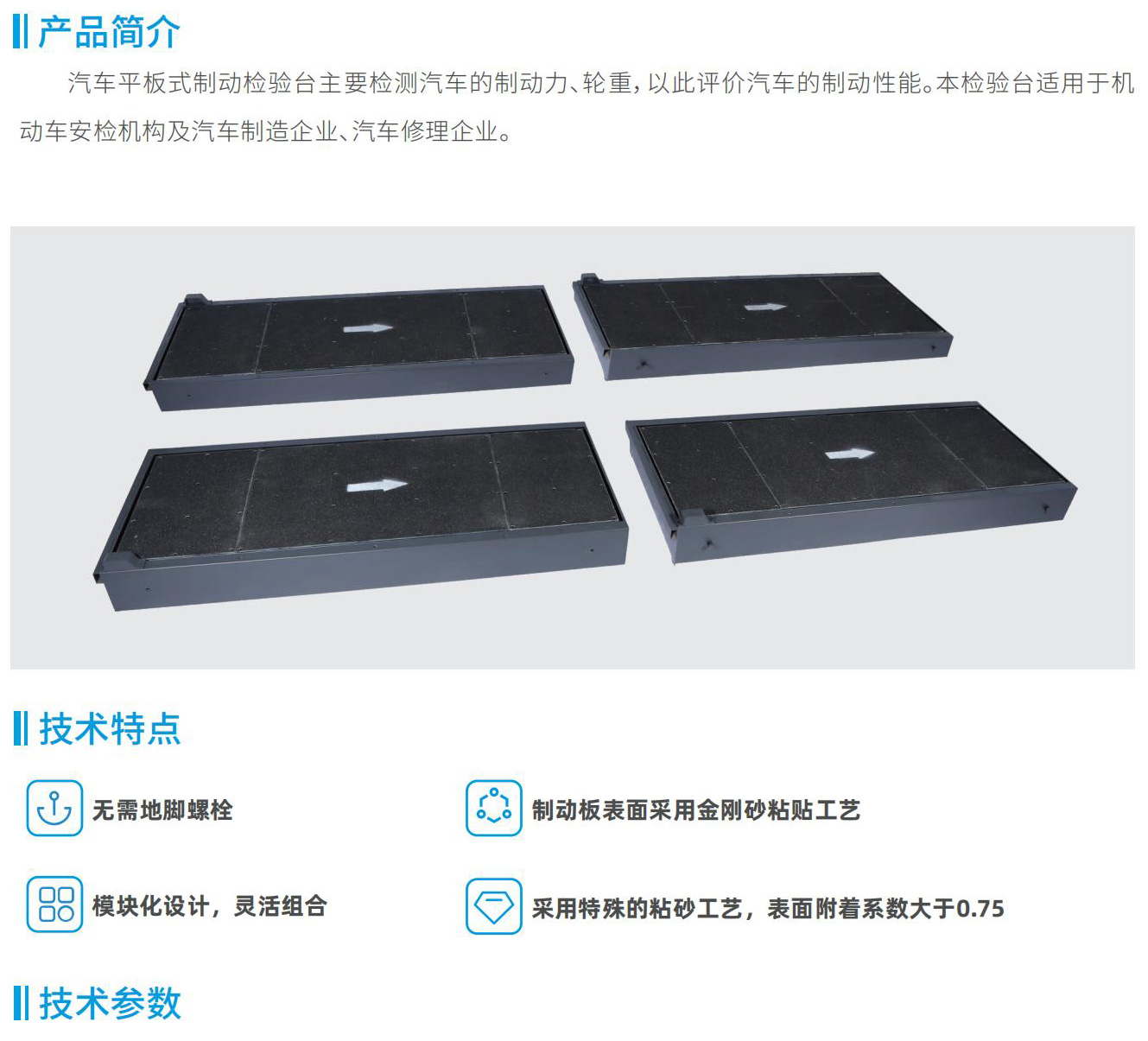 汽車平板式制動(dòng)檢驗(yàn)臺(tái)主要檢測汽車的制動(dòng)力、輪重,以此評(píng)價(jià)汽車的制動(dòng)性能。本檢驗(yàn)臺(tái)適用于機(jī)動(dòng)車安檢機(jī)構(gòu)及汽車制造企業(yè)、汽車修理企業(yè)。