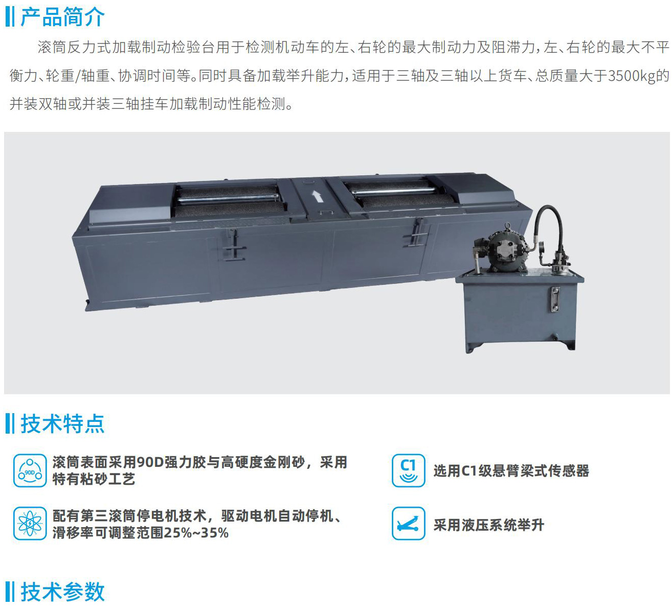 滾筒反力式加載制動檢驗臺用于檢測機動車的左、右輪的最大制動力及阻滯力,左、右輪的最大不平衡力、輪重/軸重、協(xié)調(diào)時間等。同時具備加載舉升能力,適用于三軸及三軸以上貨車、總質(zhì)量大于3500kg的并裝雙軸或并裝三軸掛車加載制動性能檢測。